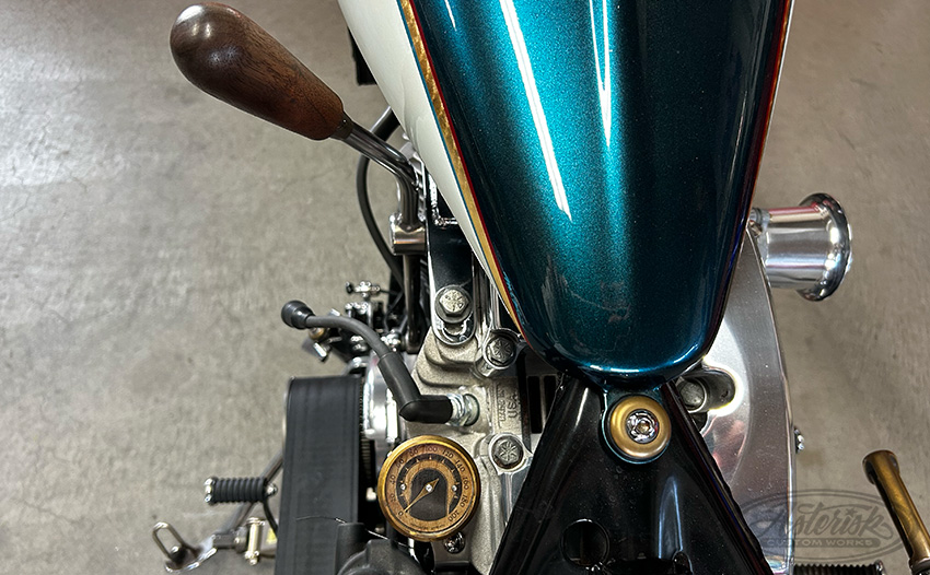 木目調なメータのパネルはシフトのノブと。そして他の真鍮のパーツ(スペーサーやキックペダルなど)とも、狙ったかのようにマッチしています